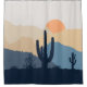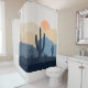 mexikanische Wüste bei Sonnenaufgang mit Sonne, Bergen und Kakteen Dekoration in marineblau, orange, blau und beige Farben auf pastellgrauem Hintergrund