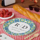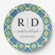 Blaue und gelbe Fliesen Hochzeitsplatte. Dieses charmante, mediterran inspirierte Hochzeitsdesign strahlt ein lebendiges und fröhliches Ambiente aus, das an die sonnigen italienischen Küsten erinnert. Das Design ist raffiniert und spielerisch und eignet sich perfekt für eine Feier, die die Wärme und Schönheit eines italienischen Sommers einfangen soll. Die Initialen des Paares und ihre Namen sind in einem runden Rahmen ordentlich platziert, sodass alle wesentlichen Details leicht lesbar und stilvoll präsentiert werden können. Die Abdeckung wurde unter Verwendung einiger Elemente von Freepik.com entworfen