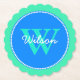 Hübsche blaue und grüne ausgebogte Massenbrettpapier-Untersetzer, mit einem weißen Polkapunkt-Kreisakzent und ein Gewohnheitsmonogramm und -text. Personifizieren Sie das grüne Buchstabemonogramm und den weißen Skripttext zum Anzug Ihr Bedarf. Groß für jederzeit verwenden Sie und macht eine nette Geschenkidee.
