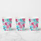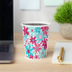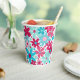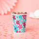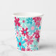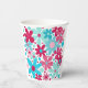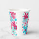 Funky blaue und rosa Blume mit blau-rosa Polka-Punkten auf weißen Papierbechern.
