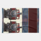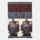 Vintager Zug im Steampunkstil in Rot und Blau mit Rädern, Fenstern, Nasen, Nüssen und Bolzen, Metallringen, Fassade aus rotem Metall und graublaue Fassade und sieht wie ein Spielzeug aus. Farbfotografie an der Vorderseite eines antiken Dampfzuges in glatt metallisch gedämpften Farben in Rot und Blues.
