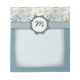 Ein eleganter Spalteentwurf mit einem Spitzenmusterbild der empfindlichen blauen und aquamarinen Rosen des Saphirs auf einem Sahnehintergrund über einer festen Babyblauunterseite, mit einem strukturierten Band und einem kundengerechten Marineblaumonogramm-Siegel in der Mitte.