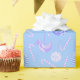 Vögel, Bonbons und Weihnachtsbaumdekorationen in blauer, naiver Kunst.