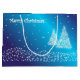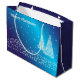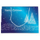 Große, glänzend glänzende Geschenktasche mit einem Bild, vorne und hinten, von zwei Weihnachtsbäumen mit weißem Sternenlicht, einem Rand von weißen Sternenlichtern, die Schnee darstellen, und "Frohe Weihnachten" mit weißem Sternenlicht auf blau geschrieben. Siehe passende Grußkarte, Puzzle Gruß, Umschlag, Gefälligkeitsbox, Geschenkmarke, Etikett, rechteckiger Aufkleber und Verpackungspapier. Die gesamte Holiday Gift Bag Kollektion finden Sie in den SONDERTOUCHS| Gastgeschenken
