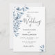 Eine trendige Hochzeitseinladung in weiß und staubblau. Ein schick weißer Hintergrund auf der Vorderseite. Die Einrichtung ist mit botanisch blauen Flecken und blauen Blättern gestaltet. Moderne, große handhabete Schrift, Typografie mit dem Text: Die Hochzeit von. Vorlagen für Namen und Hochzeitsdetails. Dunkelgrauer Text. Zurück: staubiger blauer Hintergrund.