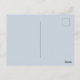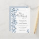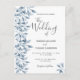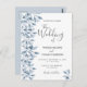 Eine trendige Hochzeitseinladung in weiß und staubblau. Ein schick weißer Hintergrund auf der Vorderseite. Die Einrichtung ist mit botanisch blauen Flecken und Blättern geschmückt. Moderne, große handhabete Schrift, Typografie mit dem Text: Die Hochzeit von. Vorlagen für Namen und Hochzeitsdetails. Dunkelgrauer Text. Zurück: staubiger blauer Hintergrund. Tipp: Wenn Sie es nicht so gewollt haben, dass es wie eine Postkarte aussieht, klicken Sie auf Anpassen, gehen Sie auf die Rückseite und entfernen Sie den Trenner und posten Sie die Briefmarke.