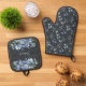 Elegantes Oven Mitt & Pot Holder Set. Der ofenförmige Mitt weist eine zarte blaue Wildblumen auf, während der Topfhalter dekorative Blumensträuße mit einem individuellen Textbereich in der Mitte präsentiert, in dem man seinen Namen hinzufügen kann.Set vor einem dunkelblau-grauen Hintergrund. Dieses Set vereint Schönheit und Funktionalität und ist somit eine stilvolle Ergänzung der Küchendekoration.