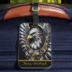 Ein stilisierter Adler mit silber-, gold- und blauen Federn aus Metall, eingerahmt in einem verzierten Kreis.