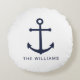 Modernes Minimalistisches Nautical Round Kissen mit marineblau Anker mit personalisiertem Namen in marineblau modernem Sans Serif Schriftart Stil auf weißem Hintergrund. Perfekt als Strandhaus Dekoration, Hauswärme Geschenk und mehr.