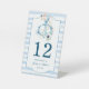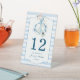 Hochzeitliche Tischnummer. Freude und Spaß beim Hochzeitsdesign. Moderne Aquarellbilder mit einem blauen Anker mit anemonischen Blume und Grün. Hellblaue Aquarellstreifen. Hellblau, hellgrün, rot, weiß, Marine. Aquamarine blaue Schrift. Elegante Schriftart-Kombination. Ideal für Hochzeiten am Strand oder für Hochzeiten im Wassersport.
