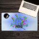 Diese Schreibtischmatte ist in einem abstrakten Design in leuchtenden Farben gehalten, das abstrakte blaue Zeichen trägt, mit grünen und blauen Schriftrollen und rosa Sternen, die den Text Peace auf dunklem, hellblauen Hintergrund zeigen.