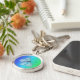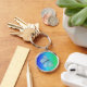 Rund silbergerrimmter Schlüsselanhänger mit einem blass blauen Schmetterling auf blauem und grünem Aquarellhintergrund