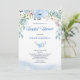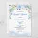 Dies ist eine hübsche Blumendusche für den Frühling oder Sommer. Die Blume ist in blauen, pfirsichfarbenen und blassgelben Farbtönen gehalten, die sich durch eine weiche Vegetation verzieren. Ihr benutzerdefinierter Text ist in der Mitte blau auf einem weißen Hintergrund. Textbereiche werden durch ein kleineres, passendes Blumenbild getrennt. Das untere Ende der Einladung hat eine subtile blaue Aquarellwäsche. Die Rückseite der Einladung ist solide passend blau, mit einer Wiederholung des kleinen Blumenbildes unten. *Dieses Design verwendet Kunstwerke von LABFcreations.