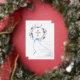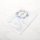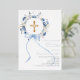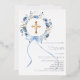 Ein eleganter weißer Hintergrund, verziert mit aquarellblauen Blumen in einem Kranz, einer blauen Schleife und einem goldenen Kreuz. Personalisieren und fügen Sie einen Namen und Details hinzu. Echt Silberfolientext.