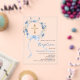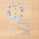 Ein klarer, transparenter Hintergrund, verziert mit wasserfarbenen blauen Blumen in einem Kranz, einem blauen Band und einem goldenen Kreuz. Personalisieren und fügen Sie einen Namen und Details hinzu.