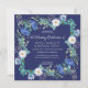 Tiefer marineblauer Hintergrund mit weißem Text für ein frisches und modernes Blumenzauberdesign. Elegante handbemalte Blume in Aquarellfarbe und Blattfolien, die in einem quadratischen Kranzrahmen angeordnet sind. Copyright, Audrey Jeanne Roberts.
