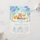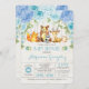 Niedliche Jungen-Duscheinladung mit bezaubernden Tieren aus Aquarellwald, umgeben von staubigen Blumen und grünen Blätter