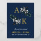 Mit Monogramm Postkarten-Hochzeitseinladung mit weißen Blume und Grün und Ihren Namen in Goldfolie. Blütengoldfolie Postcard Hochzeitseinladung in dunkelblau mit goldenen Details. Informelle Hochzeitseinladung in Postkartenform mit Blume und Ihren Initialen und Namen in Goldfolie.