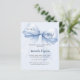 Ein weicher, hellblauer Hintergrund, mit einem großen blauen Bogen dekoriert. Personalisieren und fügen Sie einen Namen und Party-Details hinzu. Text auf dem Bogen: Es ist ein Junge! 1 Blatt = 1 Einladung mit Druckkante bis Kante.
