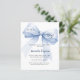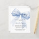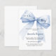 Ein eleganter weißer Hintergrund mit einem großen blauen Bogen. Personalisieren und fügen Sie einen Namen und Party-Details hinzu. Text auf dem Bogen: Es ist ein Junge! 1 Blatt = 1 Einladung mit Druckkante bis Kante.