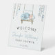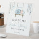 Blauer eleganter Aquarelljunge schlafend auf der Schaukel mit blumengeschmücktem Baby-Boy Duschbad Begrüßungsschild.