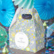 Moderne, gelbe, grüne und weiße botanische Wildbahn-Blume auf hellblauem Hintergrund für ein frisches Sommergefühl. Eine wunderschöne, koordinierende Gefälligkeitsbox, um Ihrem Party zu entsprechen. Sie können den Text ändern, um Ihre Feier zu Anzug.