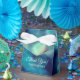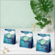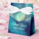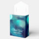 Türkisblaue Buche helle Foto Effekt individuelle Hochzeit Gefallen Box mit personalisiertem Text für den Dank an Gäste. Kundenspezifische Danksagung von Braut und Bräutigam. Abstraktes Party Bild weiß Schleifenbogen Knoten. Anpassbarer Hintergrund.