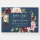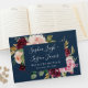 Das Design zeichnet sich durch einen eleganten, dunkelblauen Hintergrund mit einem Aquarellbouquet oder Kranz in den Farben Bordeaux, Marsala, hellblütenrosa, Pfirsich und mehr über die grünen Elemente Eukalyptus und Vintage vergoldete Blätter aus.