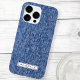 iPhone Gehäuse mit einer blauen Denim-Textur und Ihrem Namen in einem modernen, männlichen Sans Serif Schriftart.