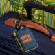 Blauer Denim Stoff mit Zip und Label Jean Stoff Gepäckanhänger