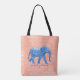 Überall druckt Tote Tasche in einem hellen korallenbedrückten Muster, mit Grafiken eines blauen Elefanten. Blauer Text liest pachyderm und kann personalisiert sein, zu lesen, was Sie gewollt.