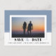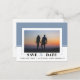 Blauer Farbblock Hochzeit Speichern Sie das Date Foto Postcard. Der obere Teil dieses Save the Date-Designs ist staubblau, während der untere Teil mit dem Text weiß ist. Es enthält auch ein Foto des Paares.