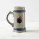Asymmetrische, ungewöhnliche, blumige Zusammensetzung von Gold und ultramarinem, blauem Farnzweig mit schwarzem strukturiertem Kreis auf weißem Hintergrund. Zweigstelle.