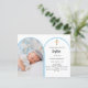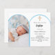 Fügen Sie Ihr eigenes Foto in vertikaler Größe hinzu. Ein himmelblau bogenförmiger Rahmen aus Foto. Eine weiße Hintergrundfarbe. Personalisieren und fügen Sie einen Namen und Details. 1 Blatt = 1 Einladung mit Druckkante bis Kante.