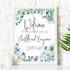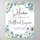 Fröhliche weiße Blume und grüne Aquarellfarben-Blätter bilden einen schönen Rahmen auf diesem hübsch blauen Frühlingsposter. Eine schicke, moderne, handgeschriebene Schüssel mit den Namen des Paares, um die Menschen zu ihrer Hochzeit willkommen zu heißen.
