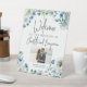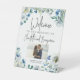 Fröhliche weiße Blume und grüne Aquarellfarben-Blätter bilden einen schönen Rahmen auf diesem hübsch blauen Frühlingsschild. Eine schicke, moderne, handgeschriebene Schüssel mit den Namen des Ehepaares, um die Menschen zu ihrer Hochzeit über ihrem Foto in der Verlobung willkommen zu heißen.