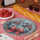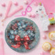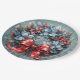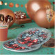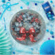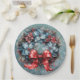 Auf einem funkelnd, blauen Weihnachtsuntergrund sitzt dieser hübsche Kranz mit einem roten Band und Blume