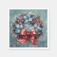Auf einem funkelnd, blauen Weihnachtsuntergrund sitzt dieser hübsche Kranz mit einem roten Band und Blume