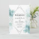 Das Design zeichnet sich durch den geometrischen Rahmen des Schlitzdrahtes und die blaue Wasserfarbe aus. Die moderne, elegante Hochzeitseinladung zeichnet sich durch eine leichte Wasserfarbe aus, die mit Imitaten aus silberfarbenem Rahmen in geometrischer Form gestaltet wurde. Personalisieren Sie Ihre Hochzeitsdetails in modernen handgeschriebenen Schriften und traditionellen Sans Serif Schrift. Die Einladungen sind schlicht weiß.