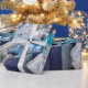 Schöne blaue und silberne Ornamente, Bänder und umhüllte Geschenke.