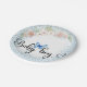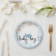 Junge Junge mit hellblauen Glitzer und blass Watercolor Blume und Rose auf weißem Papierteller. Der Schriftart ist rund und endet in einer durchgezogenen Glyphe und einem Herz als Punkt über dem i. Blauer Glitzer fasst Text und Teller. Rosa und Weiß in einem links Bogen oben verleihen einem weichen Look. Ein blauer Schmetterling, der über den Text "Baby boy" fliegt, ist ein Symbol des Wunders und der Schönheit des Lebens, das sich verändert und bereit ist, seine Flügel zu verbreiten, um diese Welt zu erkunden. Dieses Design und diese Platte können auf unterschiedliche Größen und Formen übertragen werden.