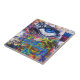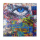 Buntes beunruhigtes modernes städtisches Graffiti-Foto auf einer Stadtwand, in Prag mit einem blauen schlechten Auge und mehrfarbigen graffitied Wörter und ein Text.