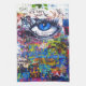 Buntes beunruhigtes modernes städtisches Graffiti-Foto auf einer Stadtwand, in Prag mit einem blauen schlechten Auge und mehrfarbigen graffitied Wörter und ein Text.