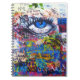 Buntes beunruhigtes modernes städtisches Graffiti-Foto auf einer Stadtwand, in Prag mit einem blauen schlechten Auge und mehrfarbigen graffitied Wörter und ein Text.