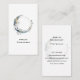 Visitenkarte mit einer mystischen Abbildung. Ein dunkelblauer Halbmond mit einer eleganten, dünnen Kontur und weißer Blume blüht an seinen Kanten.