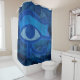 Duschvorhang mit dem Auge des Horus strukturiert blau abstrakte Design. Das Horusauge ist in blauen Tönen auf verblassten Horusaugen im Hintergrund zu sehen.