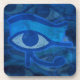 Untersetzer mit dem Auge des Horus strukturierten abstraktes blaues Design. Das Horusauge ist in blauen Tönen auf verblassten Horusaugen im Hintergrund zu sehen.