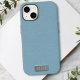 Eine zarte, blass blaue Telefonzelle, die wie Leder aussieht und Platz für Ihre Initialen auf einer metallischen Namensplatte aus Imitaten bietet. Alle Imitate und ein fabelhaftes Gehäuse. Nicht echtes Leder (aber Sie wussten das)