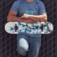 eine traditionelle Aquarellarbeit der blauen Blüten in der japanischen Art, die von einem Baum auf einem Skateboard hängt