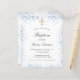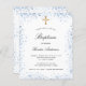 Eine moderne, elegante Taufe, die einen kleinen Jungen feiert. Ein stilvoller weißer Hintergrund mit blauen Imitaten, Staub aus Glitzer und einem goldenen Kreuz. Personalisieren und fügen Sie einen Namen und Party-Details hinzu. Schwarze Buchstaben.